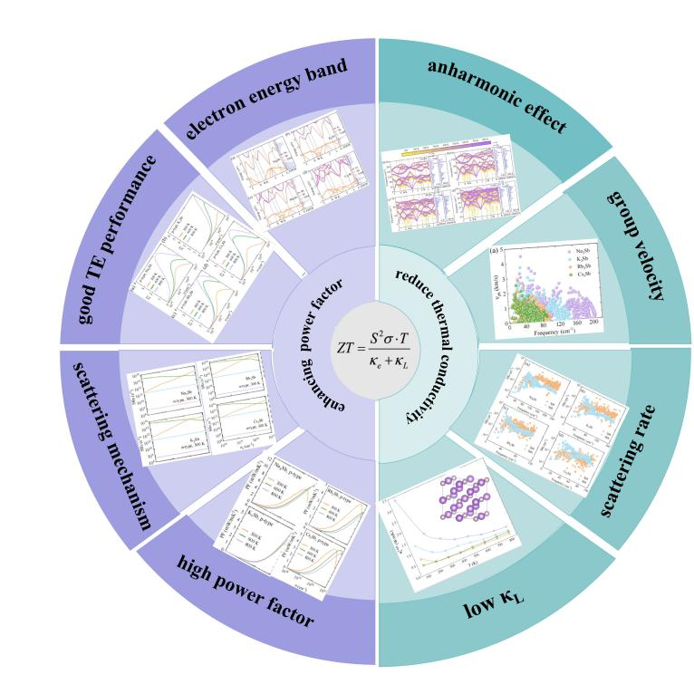 近期,烟台大学物理与电子信息学院的材料模拟与设计团队联合清华大学在碱镝化合物的热电性能研究中取得了重要进展。他们采用第一性原理计算结合自洽声子理论、压缩感知晶格动力学和玻尔兹曼传输方程的先进方案,研究了四种碱镝化合物的晶格动力学、输运性质和热电性能。通过分析声子频率的四阶非谐重整化以及四声子散射,详细探讨了这四种材料晶格热导率背后的微观机制,揭示了非谐性对热输运性质的显著影响。他们还观察到一个反常现象:在400 K以上,Rb3Sb的晶格热导率κL低于Cs3Sb,经过分析发现这主要是因为Rb3Sb的散射速率较大。最后通过考虑各种散射机制,得到了合理的电子弛豫时间和电子输运性质。由于p型M3Sb在导带底处具有较大的电子色散带,因此具有较高的电子迁移率。由于低的晶格热导率κL和良好的功率因数(PF),这四种p型碱锑化合物表现出优异的热电性能。