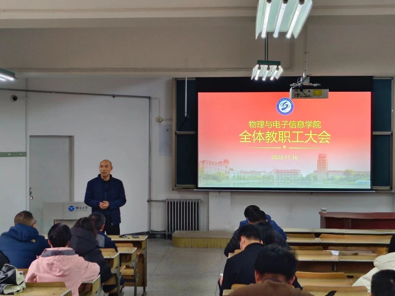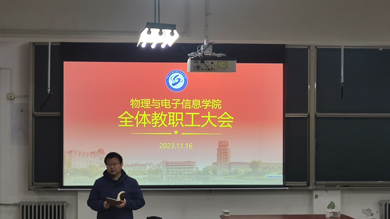 11月16日下午,物理与电子信息学院在四教101召开全院教职工大会,晋刚副院长在会上传达了“烟台大学第十一届本科教学工作会”精神,明确了学校下一步本科教学工作的主要任务和工作思路。同时就迎接2024年“烟台大学本科教育教学审核评估”工作进行相关动员和培训,解读本科教育教学审核评估相关指标,明确下一步学院、教师需要完成的相关具体工作安排。