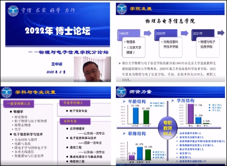 为贯彻落实烟台大学人才强校战略,2022年3月27日上午,由物理与电子信息学院举办的“烟台大学2022年博士论坛—物电学院分论坛“取得圆满成功。本次分论坛旨在为海内外优秀人才和物电学院之间搭建交流与合作的平台,增进相互信任,加深青年学者对学院的全面了解,促成高层次人才来学院干事创业。