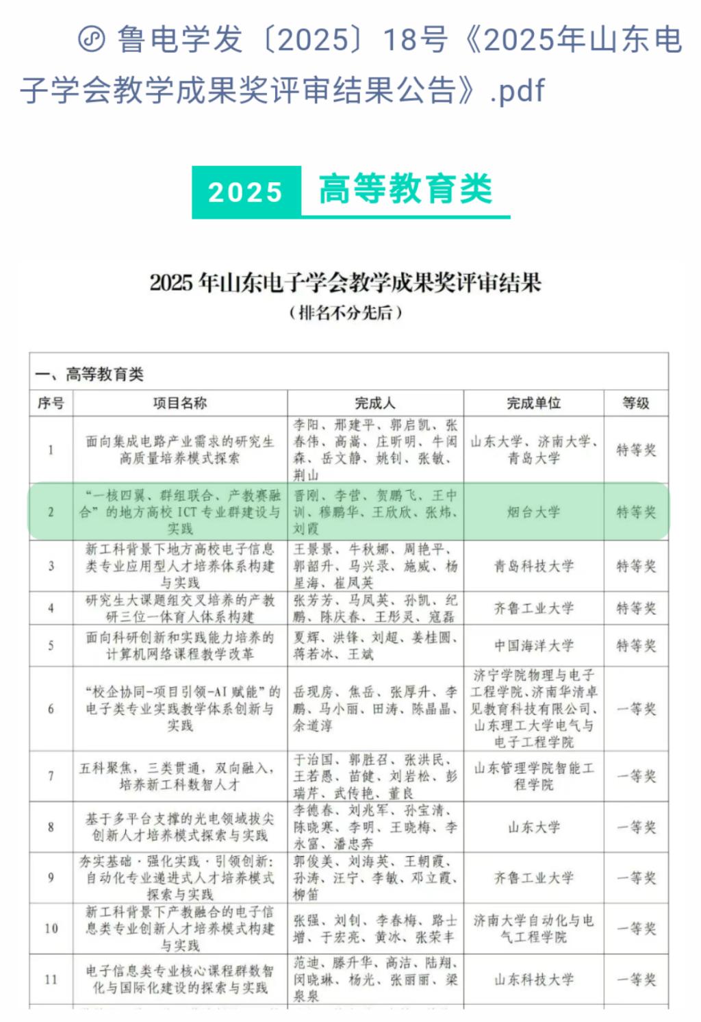 近期,根据山东电子学会鲁电学发〔2025〕18号《2025年山东电子学会教学成果奖评审结果公告》所公布的结果,我院申报的“‘一核四翼、群组联合、产教赛融合’的地方高校ICT专业群建设与实践”获评2025年山东电子学会教学成果奖高等教育类特等奖。