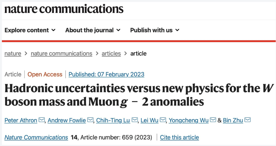 2023年2月7日,烟台大学物理与电子信息学院祝斌副教授同南京师范大学武雷教授团队(PeterAthron、Andrew Flowie、卢致廷、武雷、吴永成)在电弱精确测量拟合与新物理研究中取得重要研究进展。研究成果以“Hadronic Uncertainties versus New Physics for the W boson Mass and Muon g-2 Anomalies”为题发表《Nature Communication(自然.通讯)》(Nature Communications 14 (2023) 659)。按照高能物理的惯例,论文署名以字母顺序排名,祝斌副教授为共同通讯作者。