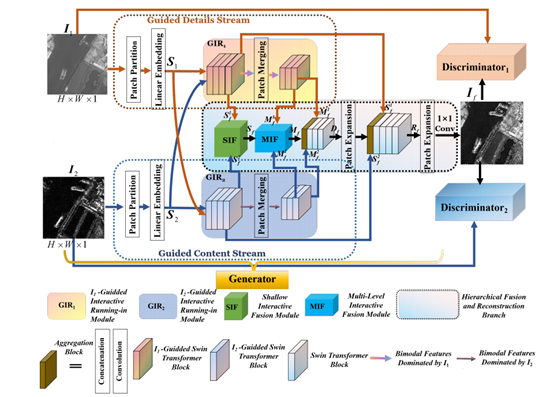 基于此,烟台大学隋晨红副教授的多模态遥感智能感知与认知团队设计开发了一种新的交互式引导生成对抗网络,称为IG-GAN,用于多模态图像融合任务。IG-GAN包括为增强细节和内容的学习以及跨模态一致性量身定制的引导双流。此外,为了使融合网络能够在没有监督的情况下生成内容完整、边缘锐利、保真度高的融合图像,还建立了一个损失函数,便于生成器和两个鉴别器之间相互博弈。结果表明,IG-GAN可以通过整合不同模态的互补信息来提高目标检测的精度。