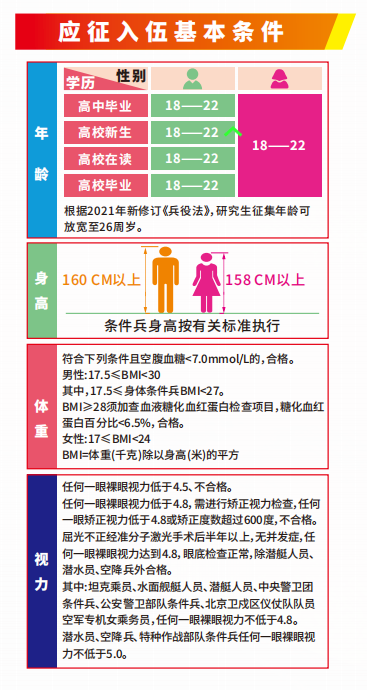 4.征集年龄:男青年为2025年年满18至22周岁,普通高等学校本专科毕业生、符合毕业条件的毕业班学生放宽至24周岁,研究生毕业生及在校生放宽至26周岁,初中毕业文化程度男青年不超过20周岁女青年为2025年年满18至22周岁,全日制研究生应届毕业生及在校生放宽至26周岁,上半年征集的2024年普通高等学校全日制本专科应届毕业生放宽至23周岁